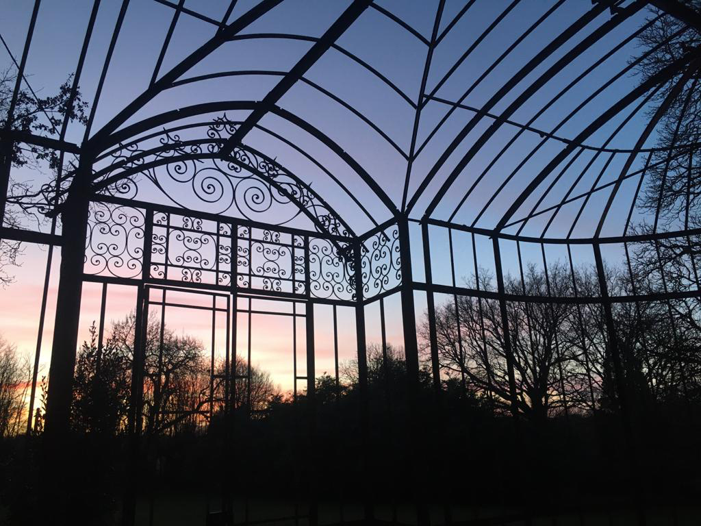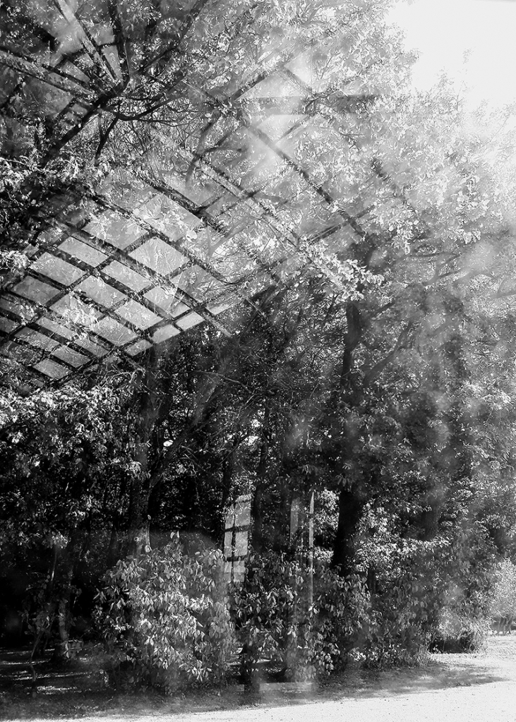 « Glasshouse » est ainsi. Elle m’a d’abord serrée dans ses bras de vieille dame au cœur un peu rouillé, elle a fait danser en son sein les artistes Oriane Dirler et Violette Dattner. Elle me chantait l’éditeur Charles-Joseph Panckoucke, l’écrivain éditeur qui présida à sa naissance, les fleurs qu’elle avait vu s’épanouir, les visiteurs, artistes, écrivains ou poètes, invités en ses murs… Je lui sifflais l’air de l’éolienne Bollée, sa belle voisine… Et, puis un jour, elle m’a serré le cœur… En septembre 2016, elle quittait le Domaine des Hauts de Loire pour d’autres cieux, elle me criait son adieu, déchirée par des mains ouvrières qui ne pouvaient comprendre que ses verres très anciens, délicatement bullés et mouchetés des salissures du temps, étaient sa mémoire et sa vie. Las, ils finirent brisés à leurs pieds. Et en ce jour dernier de démontage, cela s’est imposé ! Il me fallait saisir une dernière fois ses ombres et lumières, ses joutes palimpsestes, ses embrassades buissonnières, les reflets de cette nature immense qui l’avait vue naître. Elle me tendait ses bras tordus et patinés par le temps, me criait : Ne t’inquiète pas… je vais bien, j’emporte un peu de ce ciel avec moi, je vais renaître ailleurs… Cela s’est imposé, je n’avais pas le temps de la peindre, de la dessiner, il y avait urgence ; alors, j’ai sorti mon appareil photo oublié depuis des lustres.