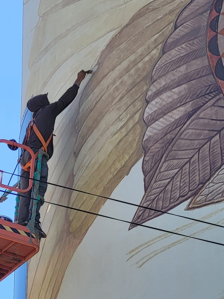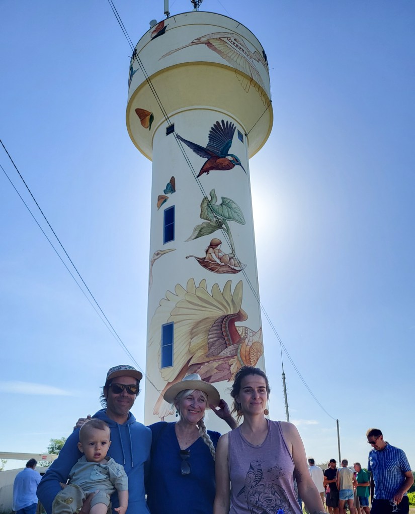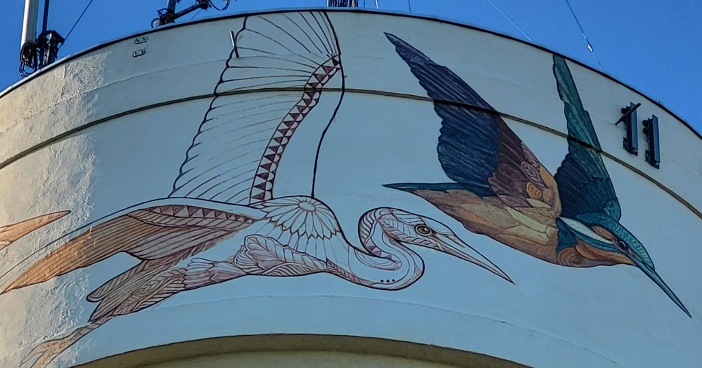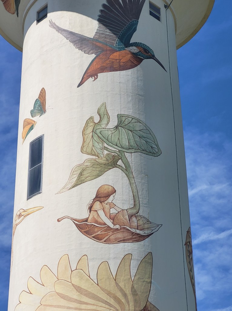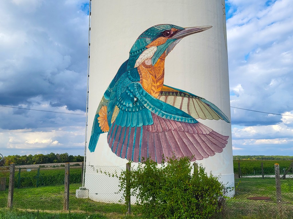 Et voici la quatrième fresque réalisée en juillet par le couple Alegria del Prado sur le château d’eau de La Briderie entre Monteaux et Mesland. Nos artistes transcendent les oiseaux et la flore de notre Val de Loire en un univers onirique dédié à Dame Nature au cœur des vignes ; la petite fille en barque nous appelle à regarder notre terre avec beaucoup plus de respect, à retrouver un équilibre harmonieux entre la nature et notre monde moderne, en songeant au devenir des jeunes générations. Nous vous laissons apprécier l’élégance et la finesse de leurs dessins où vegetalis se fait aves avec force, la nature étant une et diverse à la fois !
