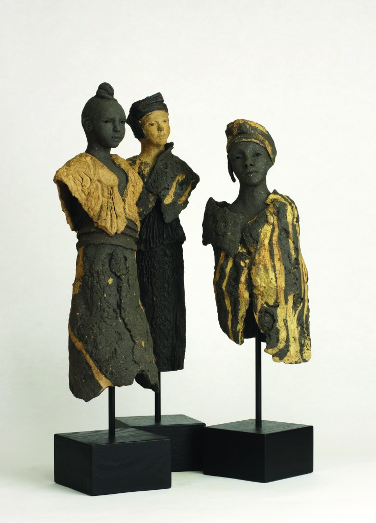Ces femmes sont sources de bien d’émotions ! Mais laissons parler notre amie sculptrice : Ces sculptures au nom d’étoiles sont en grès. Elles sont recouvertes d’émail, d’une carapace rude et brute comme la terre qui les a façonnées, faite d’empreintes, de fissures, de tracas invisibles, d’instants de mémoire. Elles sont les lieux cachés que nous transportons et qui nous modèlent. Elles sont debout tels des Guetteurs, vigilants et l’esprit en alerte, des Veilleurs, car je crois qu’il y a toujours quelqu’un qui veille sur nous. Elles paraissent solides et fières, mais leur fragilité fait que leur chute les rendra à la poussière de la terre.